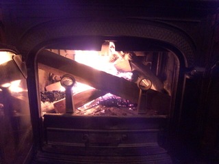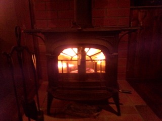 薪ストーブに火を入れてます