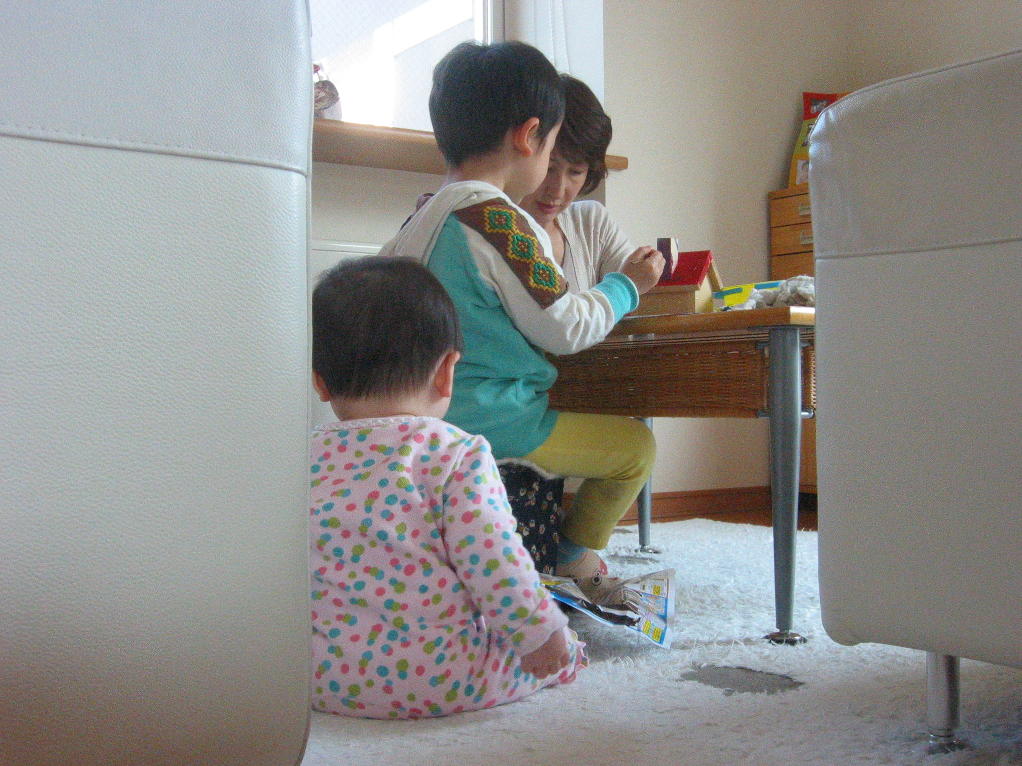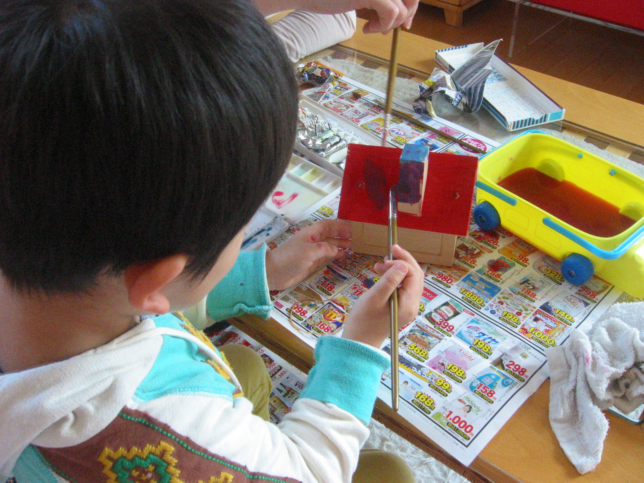 総ヒバのおうちの貯金箱に、倅が色を塗り始めました。