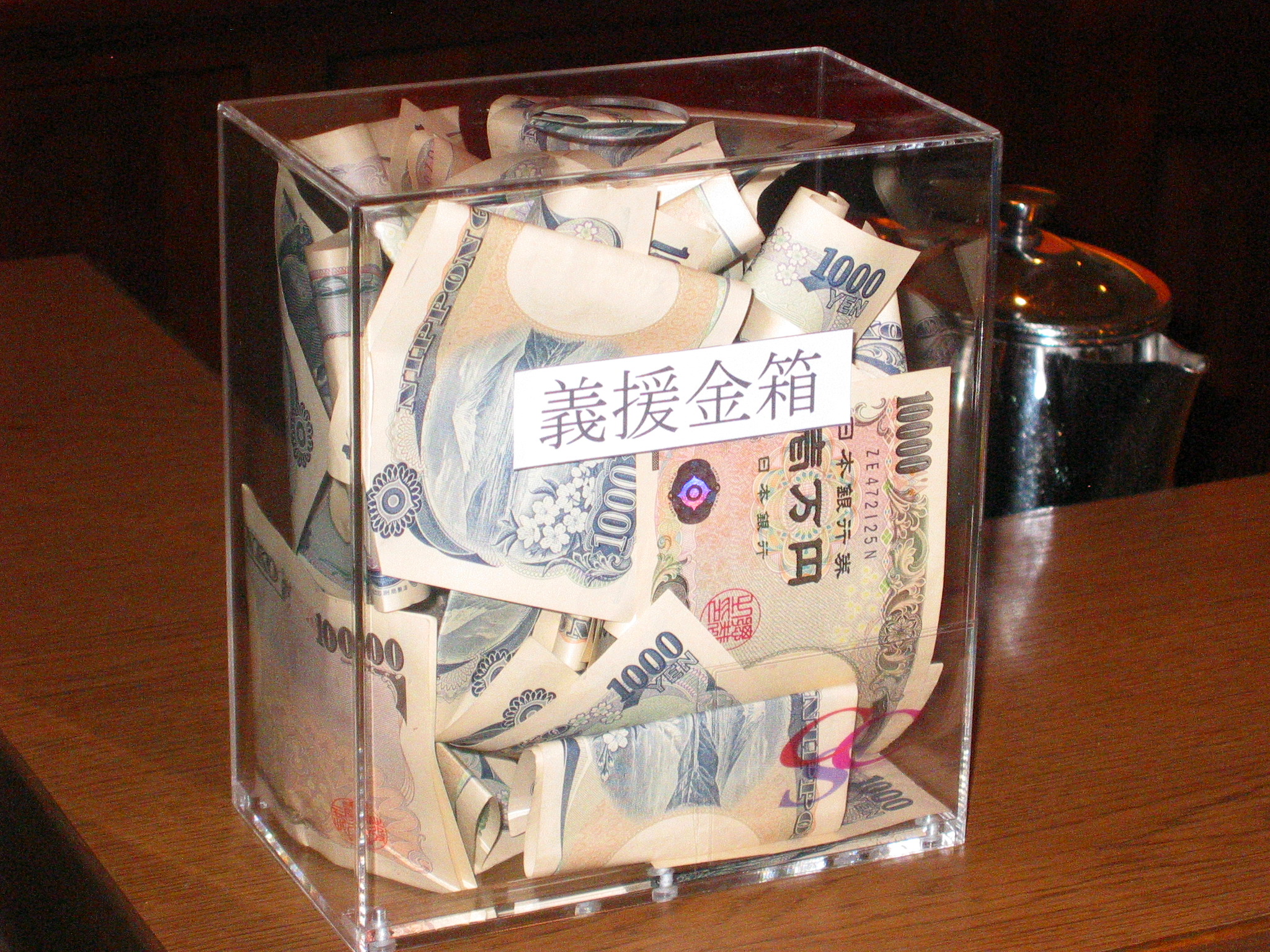 こんなに義援金が集まりました。一万円札も見える・・・。